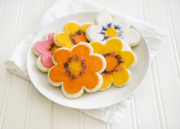 • كوب زبدة ( في درجة حرارة الغرفة ) • 2/1 1 كوب من مسحوق السكر الناعم ( سكر بودرة ) • بيضة • 2 ملعقة صغيرة نكهة الليمون • ملعقة صغيرة فانيليا • 4/3 2 - 3 كوب طحين • 2 ملعقة صغيرة بكينج بودر ( مسحوق الخبز ) • ملعقة صغيرة ملح • 2 ملعقة صغيرة من بذور الخشخاش ( اختياري ) للصوص السكر الملون : • كوب سكر ناعم • ملعقة كبيرة شيرة ( شربات ) أو عسل أبيض • 2 - 3 ملعقة كبيرة ماء • ملعقة صغيرة من نكهة الليمون • ألوان الطعام المختلفةطريقة التحضير :