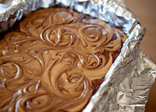 لكراميل زبدة الفول السوداني : • 2/1 كوب كريمة حلويات • 4/1 كوب ماء • 4/1 كوب سكر • 2/1 كوب زبدة الفول السوداني • ملعقة كبيرة شراب السكر ( شيرة أو شربات ) • 4/1 ملعقة صغيرة فانيليا سائلة • رشة ملح للبراونيز : • 2 عصا زبدة ( العصا = 8 ملاعق كبيرة ) • 168 جرام من رقائق الشوكولاتة ( غير محلاة ) • 56 جرام + 112 جرام من مفروم الشوكولاتة ( شبه محلاة ) • ملعقة صغيرة من مسحوق القهوة ( نسكافية ) • 4 بيضات كبيرة • 2/1 1 كوب سكر • 2/1 كوب سكر بني • 2 ملعقة صغيرة فانيليا • 4/1 ملعقة صغيرة ملح • كوب طحينطريقة التحضير :
