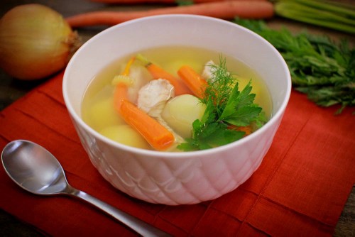 - سمكة 450 جرام ( أي نوع حسب الرغبة )<br /> - 8 أكواب ماء<br /> - 5 حبات من الفلفل الأسود ( غير مطحون )<br /> - 3 أوراق الغار الجافة<br /> - ملح<br /> - 2/1 3 كوب من البطاطس المقشرة ومقطعة قطع كبيرة<br /> - 6 جزر مقشر ( صغيرة الحجم ورفيع )<br /> - بصلة كبيرة مبشورة<br /> - 3 – 5 أعواد كرفس مفروم<br /> - ملعقة كبيرة من البقدونس الطازج<br /> - ملعقة كبيرة من الشبت الطازجطريقة التحضير :
