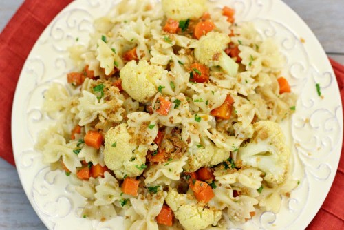 - 225 جرام مكرونة ( فيونكات ) - رأس قرنبيط مقطع إلى زهيرات - 3 جزر مقشرة ومقطعة مكعبات - 5 فصوص ثوم مفروم - 3 ملاعق كبيرة زيت زيتون - ملح وفلفل - ملعقة كبيرة خل بلسمي - 4/1 كوب مبشور جبن البارميزان - 2/1 ملعقة كبيرة زبدة - 2/1 كوب فتات الخبز ( بقسماط )طريقة التحضير :