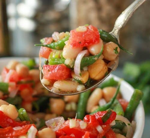 • 4 أكواب فاصوليا خضراء ( مقطعة قطع صغيرة 1 بوصة )<br /> • 400 جرام من حبوب الحمص المسلوقة<br /> • 400 جرام من الفاصوليا البيضاء المسلوقة<br /> • 3 حبات طماطم مقطعة ومنزوعة البذور<br /> • بصلة صغيرة الحجم مقطعة شرائح<br /> • 1 فص ثوم مفروم<br /> • 1 ساق كرفس مفروم<br /> • 4/1 كوب من مشوي الفلفل الأحمر الحلو<br /> • 4/1 كوب زيت زيتون أو زيت عباد الشمس<br /> • ملعقة كبيرة خل بلسمي أو الخل الأحمر<br /> • 2 ملعقة صغيرة سكر أو عسل<br /> • ملعقة صغيرة خردل ديجون<br /> • ملح وفلفل<br /> • ملعقة كبيرة بقدونس طازج مفروم<br /> • ملعقة كبيرة بصل أخضر شرائحطريقة التحضير :