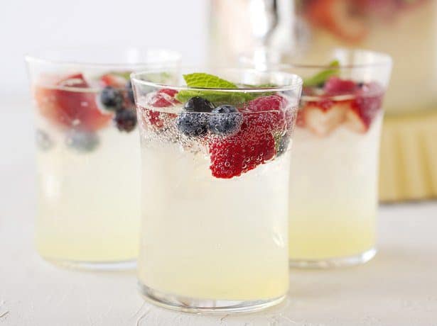 1- 2 عبوة ليمون مثلج عالى التركيز2- ماء فوار3- 2 حبة ليمون متوسطة تقطع إلى شرائح4- 2 كوب توت5- 2 كوب فراولة مقطعه شرائح6- كوب أوراق النعناع الطازجطريقة التحضير :