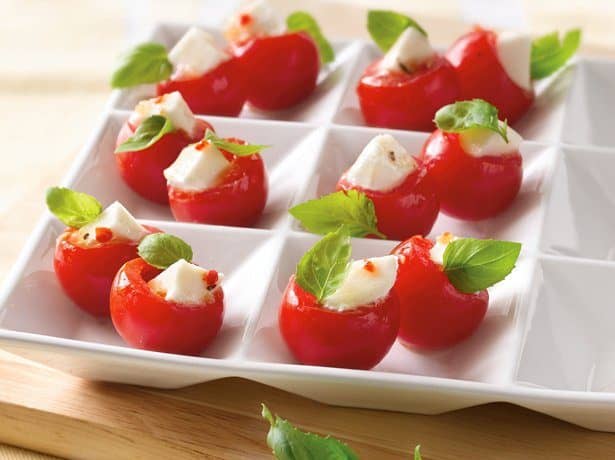 ضعى مربع الجبن الموتزوريلا داخل كل خبة طماطم