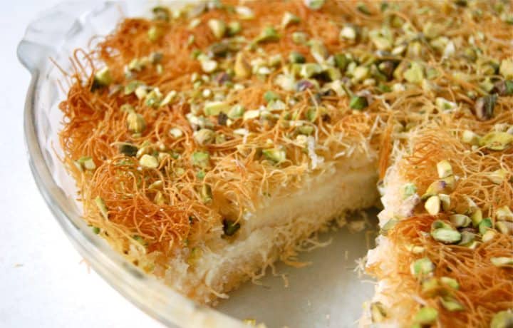 الكنافة فور خروجها من الفرن ، رشي الفستق الحلبي المفروم على سطح الصينية وقدميها