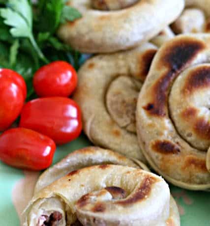 لعمل العجين :<br /> •3 أكواب طحين لجميع الأغراض<br /> •1 ملعقة صغيرة ملح<br /> •1 ملعقة كبيرة سكر<br /> •3 ملعقة كبيرة حليب بودرة <br /> •3 ملاعق كبيرة زيت نباتي<br /> •1 كوب ماء دافئ ( للعجن )<br /> •2/1 كوب سمن مذاب <br /> لعمل حشو اللحم المفروم :<br /> •2/1 كيلو لحمة مفرومة<br /> •بصلة متوسطة الحجم ومفرومة<br /> •ملح وفلفل<br /> •1 ملعقة صغيرة بهارات مشكلة<br /> •1 ملعقة صغيرة سماق<br /> •1 ملعقة كبيرة دبس رمان<br /> •2/1 كوب صنوبر محمص ( اختياري )<br /> •بقدونس مفروم