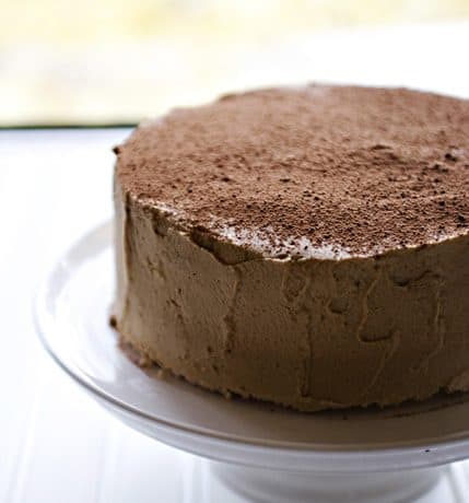 الكيك بأكمله من جميع الجوانب بكريمة الاسبرسو الداكنة، كما هو موضح بالصورة .