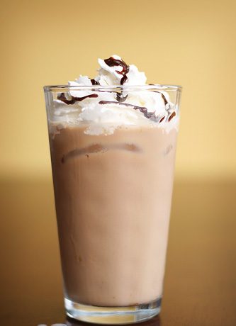 • مكعبات ثلج • 1/4 : 1/3 كوب قهوة سريعة • حليب • 1 : 2 معلقة كبيرة صوص الشيكولاته • ويبنج كريم • سكر حسب الرغبةطريقة التحضير :