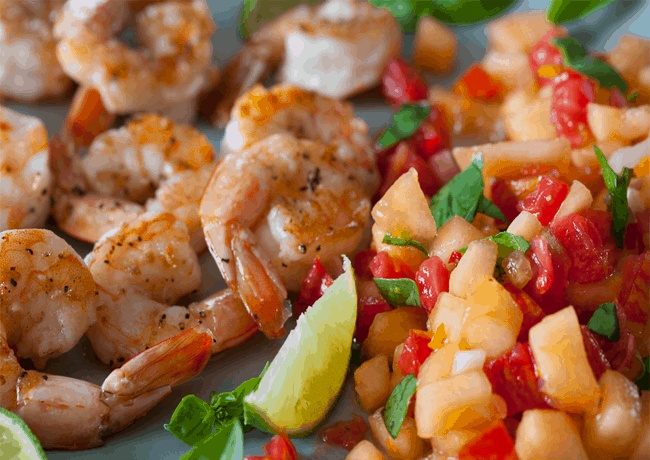 مكعبات 2سم × 2سم , ويقشر الجمبرى وينزع الحبل الرمللى أو يترك القشر حسب الرغبة , ويدق الثوم ويضاف الملح والفلفل الاسود
