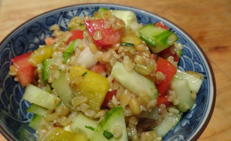 • 4/3 كوب فريك<br /> • 4/3 1 كوب ماء<br /> • 2/1 1 كوب خيار مفروم<br /> • 1 ملعقة كبيرة ريحان طازج مفروم<br /> • 1 ملعقة كبيرة بقدونس طازج مفروم<br /> • 2 حبة بصل أخضر مفروم<br /> • 1 حبة طماطم كبيرة الحجم مقطعة قطع صغيرة<br /> • 2 ملعقة كبيرة بصل مفروم ناعماً<br /> • 3 ملاعق كبيرة زيت زيتون<br /> • 2 ملعقة كبيرة خل بلسمك أو خل العنب<br /> • ملح وفلفل حسب الذوقطريقة التحضير :