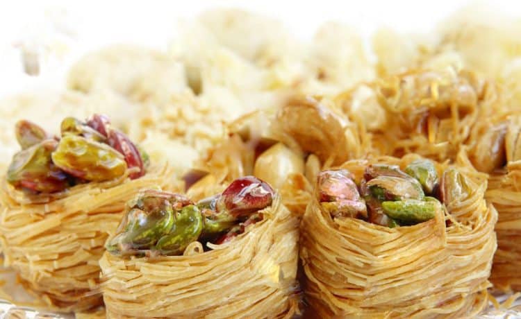 الكنافة في صينية خبز مدهونة بالزبدة، واملئي الأعشاش بالمكسرات .