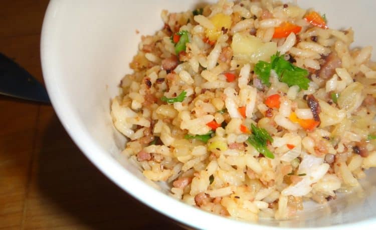 • 1 كوب أرز مطبوخ أو بقايا الأرز • 2 كوب لحم بقري مفروم ومطبوخ • 1 بصلة مفرومة ناعماً • 1 ملعقة صغيرة زعتر طازج • 1 قرن فلفل أحمر مفروم • 1 كوب أناناس مفروم • زيت الزيتون • 2 حبة بصل أخضر مفروم • 1 ملعقة كبيرة كزبرة طازجة مفروم • ملح وفلفل حسب الذوق • 1 ملعقة كبيرة صوص الصوياطريقة التحضير :