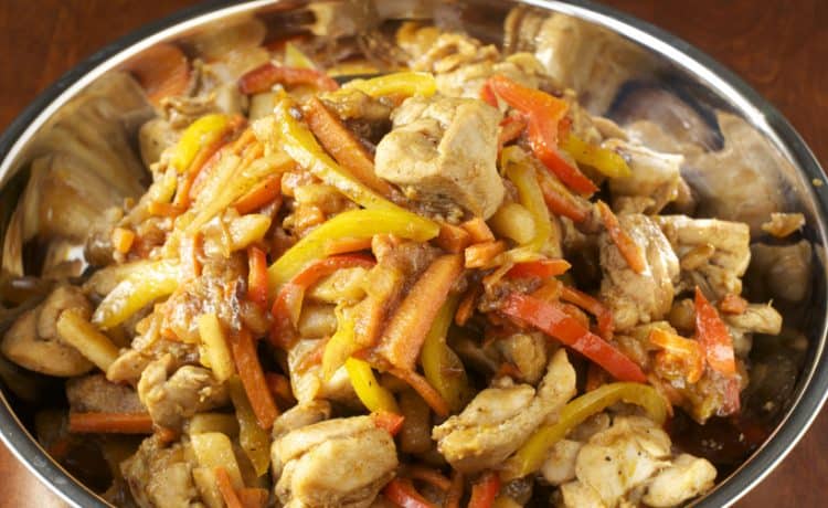 • 680 جرام أفخاذ الدجاج ( مقطعة مكعبات ) • 4/1 كوب زيت الكانولا أو زيت نباتي • 1 حبة بصل • 1 حبة بطاطس مقطعة شرائح • 1 حبة جزرة مقطعة شرائح • 1 ملعقة صغيرة توابل • 4/1 ملعقة صغيرة كركم • 1 ملعقة صغيرة بابريكا • 1 ملعقة صغيرة ملح • 4/1 كوب ماء • 100 جرام فلفل حلو • 4/1 ملعقة صغيرة فلفل أسود • 1 ملعقة صغيرة صوص الفلفل الأخضر الحارطريقة التحضير :