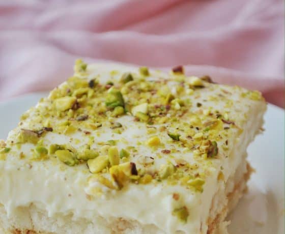 قليلاً، ثم رشي كمية وفيرة من الفستق المفروم على سطح الصينية .
