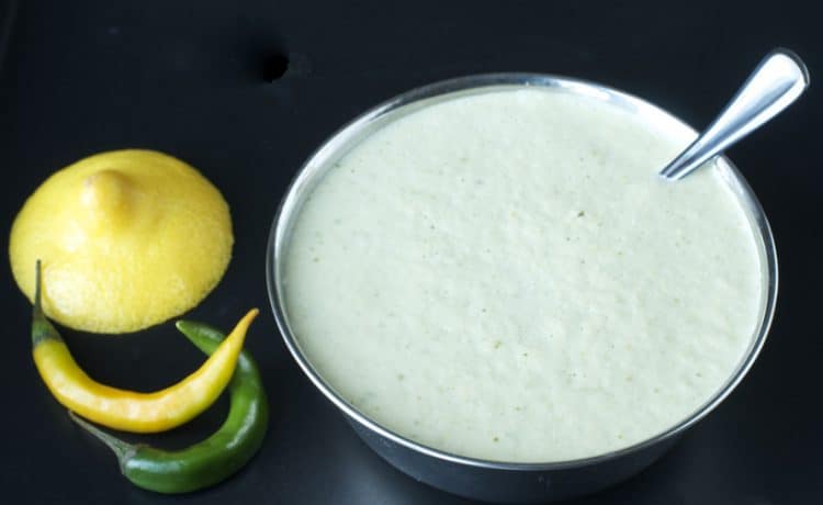 • 3/1 كوب مبشور جوز الهند<br /> • 2/1 كوب ماء<br /> • 100 جرام فلفل أخضر حار<br /> • 3 قرون فلفل هالبينو<br /> • 1 فص ثوم<br /> • بصلة صغيرة<br /> • عصير ليمونة واحدة<br /> • 4/1 كوب خل أبيض<br /> • 4/1 كوب زيت الكانولا أو زيت الزيتون<br /> • 1 ملعقة صغيرة ملحطريقة التحضير :