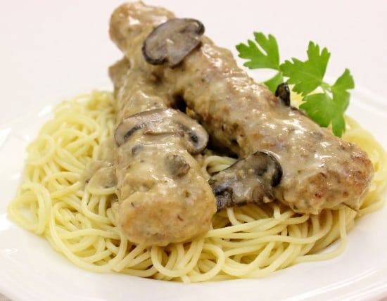 لكباب الدجاج : • 4 قطع من صدور الدجاج • 2 بيضة • 3 شرائح خبز أو 3 أكواب فتات الخبز الطازج • 2/1 1 ملعقة كبيرة بقدونس طازج • 4/1 كوب مبشور جبن البارميزان • 1 ملعقة صغيرة مسحوق الثوم • 1 ملعقة صغيرة مسحوق البصل • ملح وفلفل لصلصة الفطر : • 450 جرام فطر طازج ( صغير الحجم ) • 3 - 5 ملاعق كبيرة مشروم مجفف • 2 ملاعق كبيرة زبدة • بصلة مفرومة ناعمة • 2 فصوص الثوم • 1 غصن الزعتر • 2/1 1 ملعقة كبيرة طحين • 4/1 1 كوب مرق الدجاج • 3/1 كوب كريمة لباني ( كريمة طبخ )طريقة التحضير :