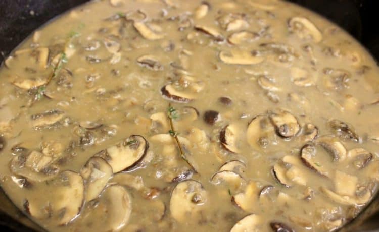 • 450 جرام فطر طازج ( صغير الحجم ) • 3 - 5 ملاعق كبيرة مشروم مجفف • 2 ملاعق كبيرة زبدة • بصلة مفرومة ناعمة • 2 فصوص الثوم • 1 غصن الزعتر • 2/1 1 ملعقة كبيرة طحين • 4/1 1 كوب مرق الدجاج • 3/1 كوب كريمة لباني ( كريمة طبخ )طريقة التحضير :