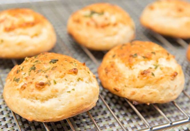 • 2/1 2 كوب طحين الخبز • 4/3 كوب حليب كامل الدسم بارد • 4 ملاعق كبير زبدة باردة • 4/3 ملعقة صغيرة بودرة الثوم • 1 كوب مبشور جبن الشيدر • 2 ملعقة كبيرة زبدة مذابة • 4/1 ملعقة صغيرة بقدونس مجفف • رشة ملحطريقة التحضير :