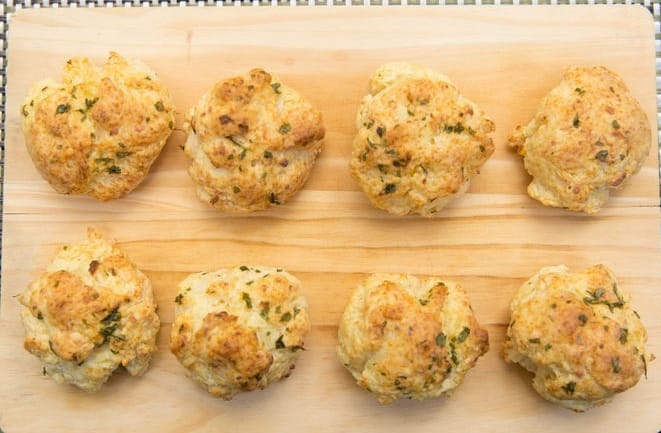 • 2 كوب طحين لجميع الأغراض • 2 ملعقة صغيرة بكينج بودر ( مسحوق الخبز ) • 2/1 ملعقة صغيرة صودا الخبز ( بيكربونات الصودا ) • 1 ملعقة صغيرة سكر • 4/1 ملعقة صغيرة ملح • 1 ملعقة صغيرة بودرة ثوم • 4/1 ملعقة صغيرة مسحوق الفلفل الحار • 1 كوب مبشور جبن الشيدر بالفلفل • 1 كوب لبن رائب بارد • 2/1 كوب + 2 ملعقة كبيرة زبدة مذابة ( غير مملحة ) • 1 ملعقة صغيرة بقدونس مفرومطريقة التحضير :