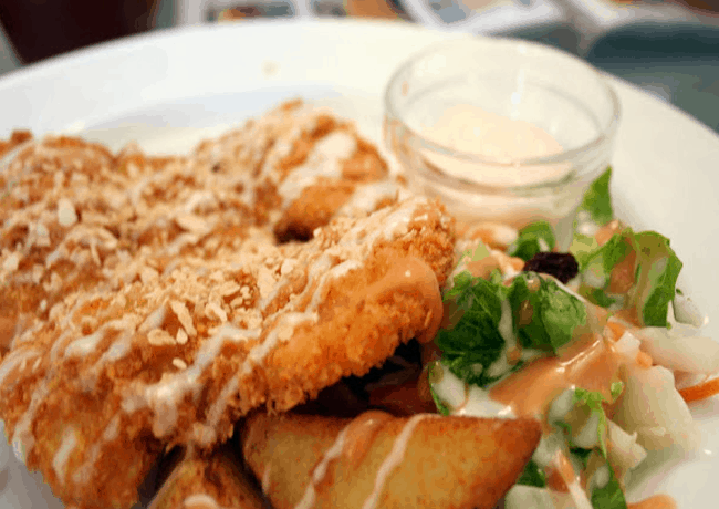 • 8 شرائح سمك كبيرة . • 1 تفاحة حمراء . • ¾ كوب دقيق الشوفان . • 1 تفاحة صفراء . • 1 كوب دقيق . • 2 ملعقة كبيرة زبدة . • 1 ملعقة كبيرة ملح . • 1 ملعقة كبيرة بهار مشكل . • 1 ملعقة كبيرة خل . • ½ ليمونة . • 2 بيض .طريقة التحضير :
