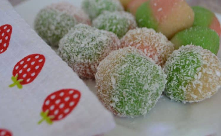 • 1 كوب لوز • ألوان الطعام ( أحمر ، أخضر ) • 5 - 6 ملاعق كبيرة ماء ورد • 2/1 كوب سكر • ماء ساخن • مبشور جوز الهند • حبيبات السكر الخشنطريقة التحضير :