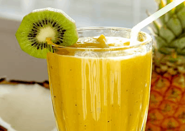 • 1 حبة أناناس . • 5 حبات كيوى . • 5 حبات خوخ . • 9 ملاعق قطر . • 12 مكعب ثلج . • 2 ملعقة كبيرة حليب بودرة .طريقة التحضير :