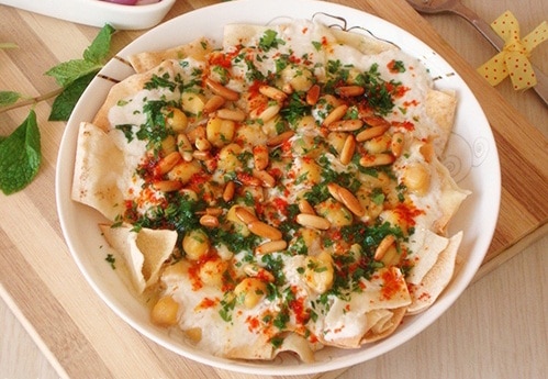 • 1 كوب حمص <br /> • 1/2 معلقة صغيرة بيكنج صودا<br /> • 1 معلقة صغيرة ملح<br /> • 2 خبز لبنانى <br /> • 1 و 1/2 كوب من اللبن الزبادى <br /> • 1 عصير ليمونة <br /> • 1/4 كوب طحينة<br /> • 1 فص ثوم مهروس<br /> • 1/2 معلقة صغيرة ملح<br /> • 1/3 كوب صنوبر مقلى <br /> • 1/2 كوب بقدونس مفروم<br /> • 1 معلقة صغيرة بابريكاطريقة التحضير :