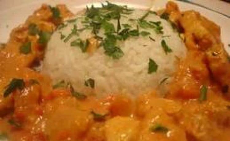 يقدم الدجاج بالكارى ساخناً مع الارز البسمتى المسلوق وبطاطس محمرة