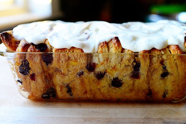 . قدمي خبز الطبقات بالبرتقال والزبيب مع كوب من الشاي الساخن .