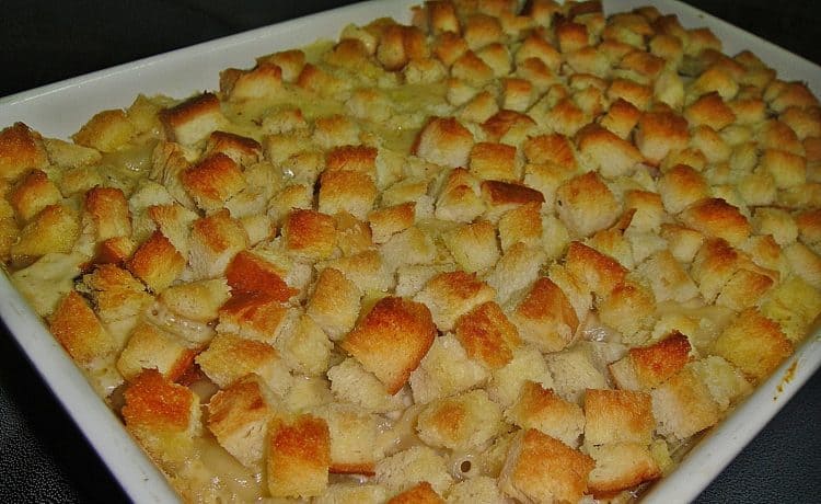 بالزبدة ثم ضعى بداخلها المكرونة ووزعى على السطح مكعبات الخبز .