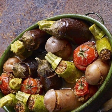يطهى بشكل جيد، ثم رصي محشي الخضروات في طاجن خزفي مقاوم للحرارة مبطن بشرائح