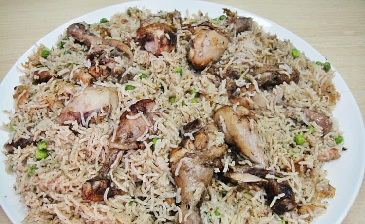 •انقلى الأرز الى طبق التقديم ورصى فوقه أفخاذ الدجاج وقدميه فورا .