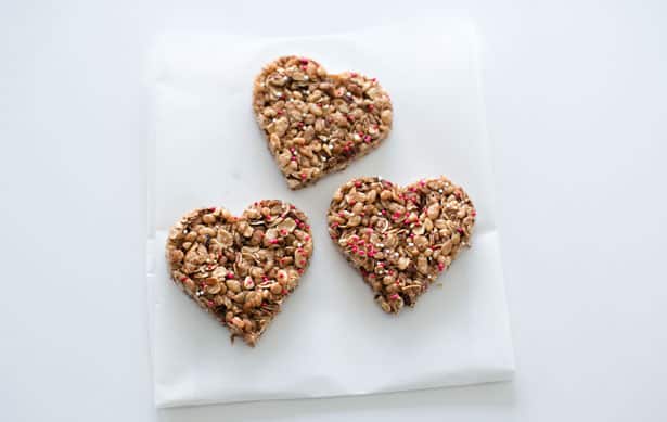 • 2 كوب حبوب الارز المقرمشة ( كرسبى رايس ) • 2 كوب شوفان ( العادى أو السريع ) • 1/3 كوب نوتيلا بالبندق • 1/3 كوب عسل أبيض • 1/2 كوب جوز مفروم ( يمكن استبداله بأى نوع اخر من المكسرات ) • 3 معلقة كبيرة زبدة مذابة • رشة ملح • قطاعات كوكيز على شكل قلوب • سكاكر ملونة ( أحمر , أبيض , وردى ) اختياري