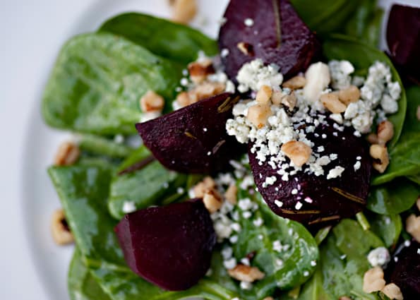 لصوص السلطة :<br /> • 2 ملعقة كبيرة عسل أو شراب القيقب<br /> • 1 ملعقة كبيرة خل<br /> • 1 ملعقة كبيرة عصير ليمون <br /> • 2 ملعقة صغيرة خردل ديجون<br /> • ملح وفلفل أسود<br /> • 3/1 - 4/1 كوب زيت زيتون<br /> لشواء البنجر :<br /> • 4 - 5 حبات بنجر<br /> • زيت زيتون<br /> • ملح وفلفل<br /> • إكليل جبل مفروم<br /> للسلطة :<br /> • أوراق الجرجير أو السبانخ الطازج<br /> • فتات جبن الريكفورد<br /> • عين جمل محمص