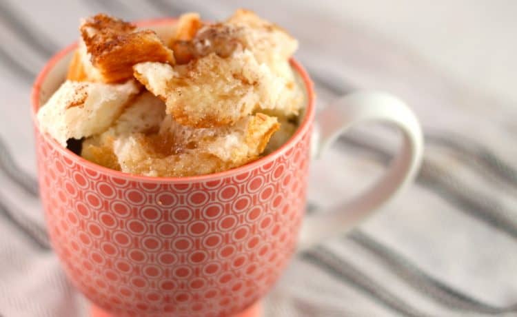 البيض بشكل جيد ثم أضيفي بضع مكعبات خبز على سطح الكوب ورشي قليل من القرفة .