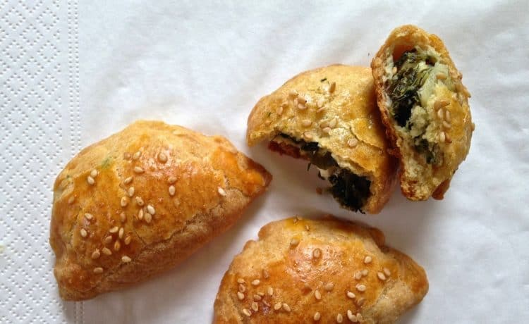 • مقادير العجينة :- <br /> • 2 كوب طحين <br /> • 2 معلقة صغيرة بيكنج صودا <br /> • 1/4 معلقة صغيرة ملح<br /> • 1 كوب حليب كامل الدسم <br /> • 1 كوب زبدة مذابة أو زيت <br /> • 1 بيض<br /> • 1صفار بيضة <br /> • بذور السمسم <br /> • مقادير الحشوة :- <br /> • 3 كوب سبانخ مفرومة ( طازجة أو مجمدة )<br /> • 3 بصل أخضر مفروم <br /> • 3 فص ثوم مفروم<br /> • 3/4 كوب جبن فيتا مفتتة <br /> • 1/2 كوب شبت مفروم<br /> • ملح والكثير من الفلفل الأسودطريقة التحضير :