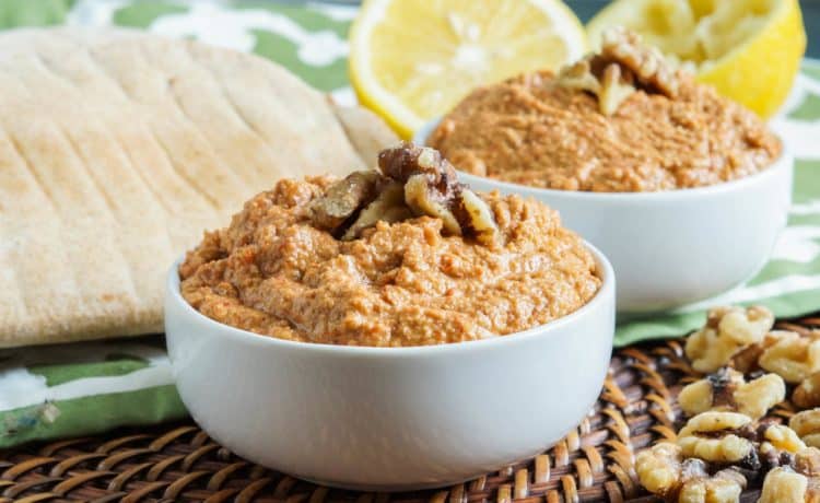 • 1 معلقة كبيرة رقائق الفلفل الأحمر الحار • 1/2 معلقة صغيرة كمون مطحون • 3/4 كوب جوز محمص • 1/4 كوب فتات الخبز( بقسماط ) • 1/4 كوب زيت زيتون • 2 معلقة كبيرة دبس رمان • 1/4 كوب معجون طماطم • 2 : 3 فلفل أحمر حلو • 1 و 1/2 كوب من الماء الدافئ • 1/2 معلقة صغيرة ملحطريقة التحضير :