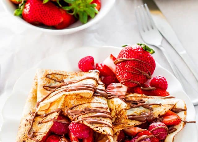 لعجينة الكريب :<br /> • 1 كوب حليب كامل الدسم<br /> • 6 ملاعق كبيرة ماء<br /> • 2 بيضة<br /> • 3 ملاعق كبيرة زبدة مذابة<br /> • 2/1 1 ملعقة كبيرة سكر<br /> • 1 ملعقة صغيرة فانيليا سائلة<br /> • 4/1 ملعقة صغيرة ملح<br /> • 1 كوب طحين<br /> لحشو الكريب :<br /> • شوكولاتة نوتيلا<br /> • فراولة طازجةطريقة التحضير :