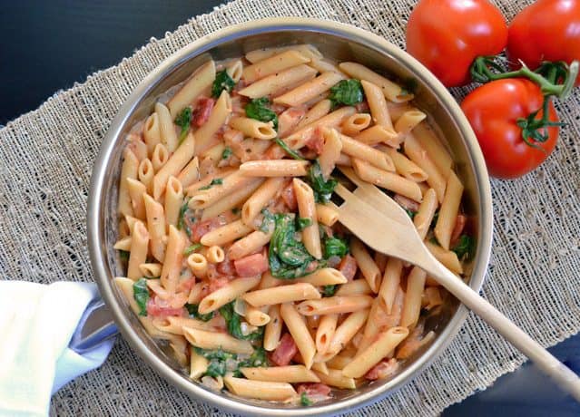 •225 جرام مكرونة أقلام ( بينا ) •بصلة صغيرة الحجم •2 فصوص ثوم •1 ملعقة كبيرة زيت زيتون •421 جرام مكعبات الطماطم •2/1 ملعقة صغيرة أوريغانو •2/1 ملعقة صغيرة ريحان مجفف •رشة رقائق الفلفل الأحمر •2/1 ملعقة صغيرة ملح •فلفل أسود ( حسب الذوق ) •2 ملعقة كبيرة معجون الطماطم •56 جرام جبن كريمي •4/1 كوب مبشور جبن البارميزان •253 جرام سبانخ طازجطريقة التحضير :
