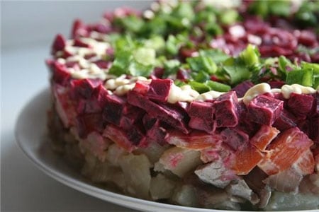 البطاطس المسلوقة – الشمندر المسلوق – شرائح البصل –مكعبات التفاح ) .