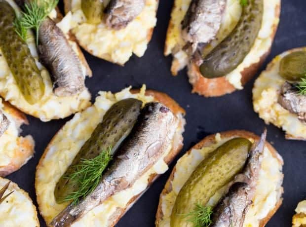 • 1 رغيف خبز فرنسي • 15 سمك الإسبرط أو السردين ( معلب ) • 2 كوب مخلل مقطع شرائح • 2 ملعقة كبيرة مايونيز • 6 بيض مسلوق • ملح وفلفل حسب الذوقطريقة التحضير :
