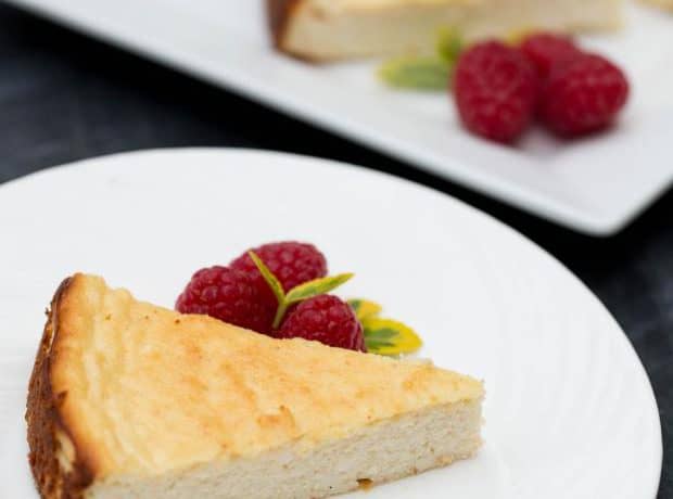 قطعي كيك الجبن إلى مثلثات وقدميه بارداً أو دافئاً مع