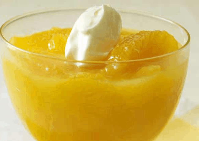 • 4 ملاعق صغيرة جيلاتين . • ½ كوب ماء ساخن . • 3 بيضات . • ¾ كوب سكر بودرة . • ½ كوب قشطة خفق . • 1 كوب بوريه البرتقال ( مقشر ومفصص ومخلوط جيدا بالخلاط ) . • 1 ليمونة بوريه بنفس طريقة البرتقال . • 2 علبه يوسفى مقشر للتزين .طريقة التحضير :