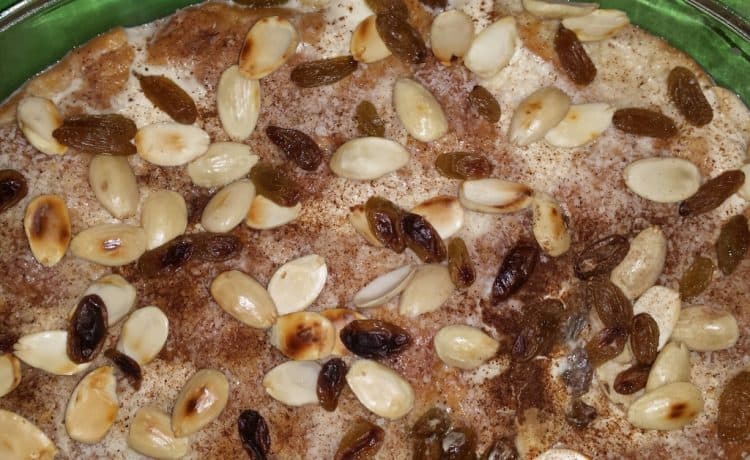 • 2 كوب حليب<br /> • 2 كوب كريما سائلة<br /> • 1 كوب سكر<br /> • ملعقة قرفة صغيرة<br /> • لوز<br /> • جوز هند<br /> • زبيب<br /> • علبة قشطة صغيرة<br /> • ملعقة فانيلا صغيرةطريقة التحضير :