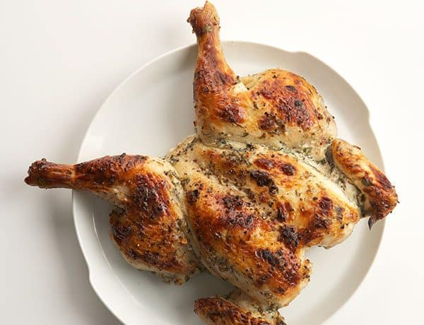 •افتحى الدجاجة من المنتصف مثل الكتاب باستخدام مقص المطبخ واقطعى على طول العمود الفقرى ثم اكسرى عظمة الصدر للسماح بوضع الدجاج بشكل مسطح كما هو موضح بالصورة .