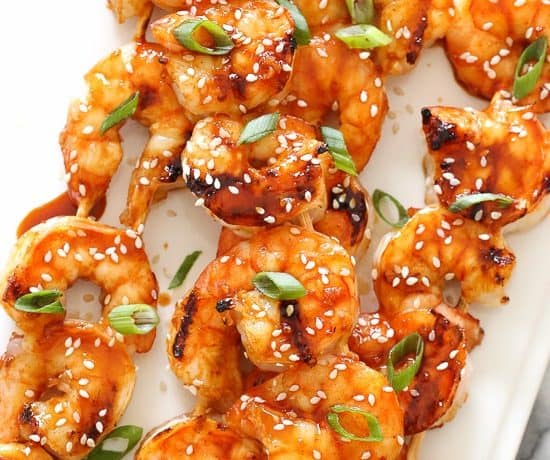 مقادير صلصة العسل :- • 2 معلقة صغيرة عسل • 2 معلقة صغيرة كاتشاب • 2 معلقة صغيرة صلصة الصويا • 1/2 معلقة صغيرة زيت السمسم • 1 فص ثوم مفروم • 1/2 معلقة صغيرة زنجبيل طازج مفروم مقادير الجمبرى :- • 1 كيلو جمبرى جامبو مقشر ( الوزن بعد التقشير ) • 1/4 معلقة صغيرة ملح • 8 أسياخ خشبية ( منقوعة فى الماء لمدة 30 دقيقة حتى لا تحترق ) • زيت سبراى الطبخ • 2 معلقة كبيرة بصل أخضر مقطع شرائح رقيقة • 1 معلقة صغيرة سمسمطريقة التحضير :