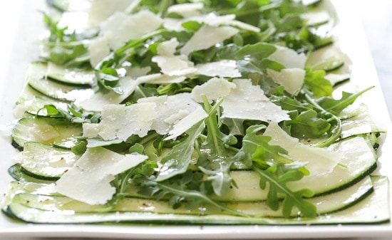 بعد ذلك وزعى على سطح الكوسا أوراق الجرجير وشرائح البارميزان .