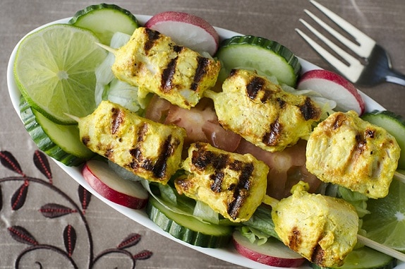. وأخيراً تناولي كباب الدجاج المشوي مع سلطة الفول والحمص والخبز العربي.