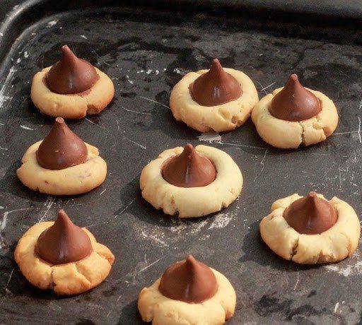 . قومي بتشكيل العجينة علي شكل كرات صغيرة الحجم ثم رصيها في صينية خبز مبطنة بورق الزبدة أو ورق الالومنيوم ثم قومي بالضغط علي منتصف الكرات بإستخدام صباع الإبهام لعمل ثغرة في الكرات كما هو موضح بالصورة .