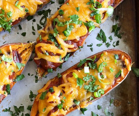 • 6 حبات بطاطا حلوة صغيرة الحجم • القليل من زيت الزيتون • 1/2 ملعقة كبيرة توابل التاكو • 1/4 ملعقة صغيرة ملح • 1/8 ملعقة صغيرة فلفل أسود • 1 كوب فاصوليا حمراء مهروسة • 3/4 كوب سالسا • 3/4 كوب جبن شيدر مبشورة ( قليلة الدهن ) • 2 بصل أخضر مقطع شرائح رقيقة • 1 ملعقة كبيرة كزبرة مفرومةطريقة التحضير :