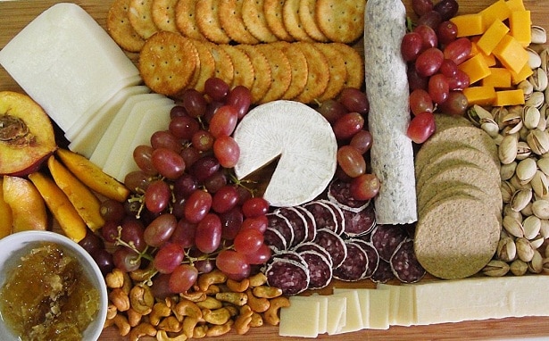 • جبن أبيض طرى • جبن أزرق • جبن الماعز • جبن شيدر • عنب طازج • تين طازج أو أى نوع من أنواع الفواكه الطازجة • عسل أبيض • مكسرات مختلفة • بريتزل وكوكيز مالح وخبز الحجر • شرائح سلامىطريقة التحضير :